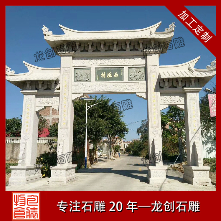 三門農村石牌樓:從目前的石牌樓的設計款式來看,三門農村村口農村石牌樓經常安裝在農村的出入口處。鄉村牌坊的設計是經過歷史發展而沉淀下來的。它廣泛用于農村建設和旅游區及寺院等處。它在使用中中很受大眾們的歡迎。三門農村石牌樓造型精美、設計對稱,整體設計以及設計款式及造型也有許多新的改進和更新。它選擇了更加多樣的精美雕塑圖案,這樣會更加打造精美的牌坊作品。普通三門農村石牌樓價格在12-25萬元左右。雕刻很精細的石牌樓,價格可能幾十萬。